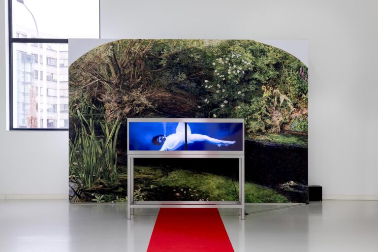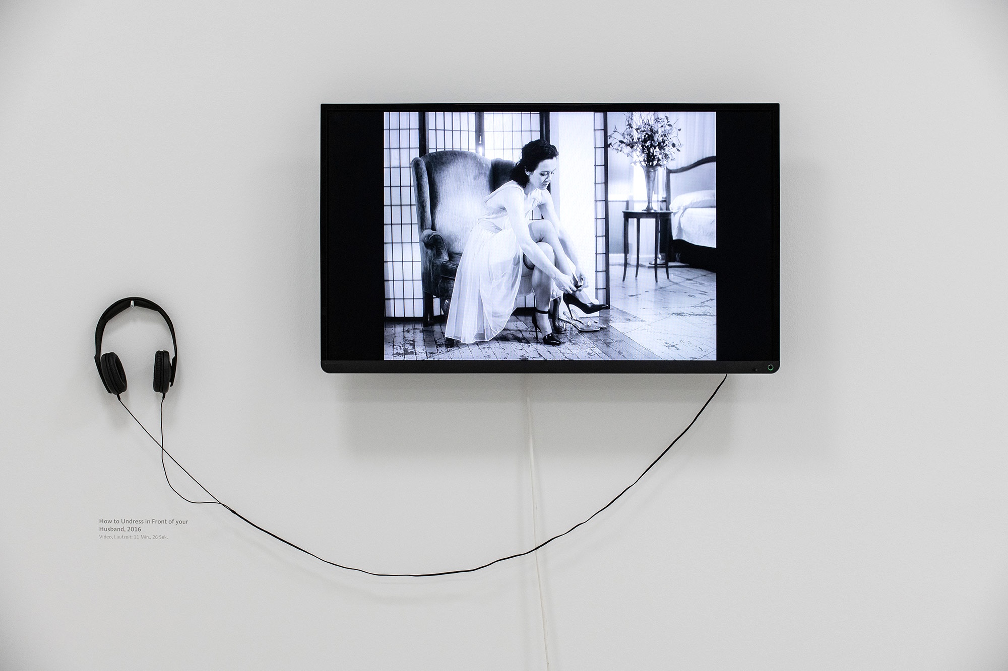 Alongside OPHELIA, the exhibition presents two additional video performances and four photographic works. In How to Undress in Front of Your Husband (2016), Marcin remakes Dwain Esper’s 1937 short film, performing a series of “Dos” and “Don’ts” for women removing their clothing in front of their husbands. She assumes multiple roles, shedding her clothes in ways that are exemplary, clumsy, or stumbling, subverting traditional gender expectations with humor and critique.