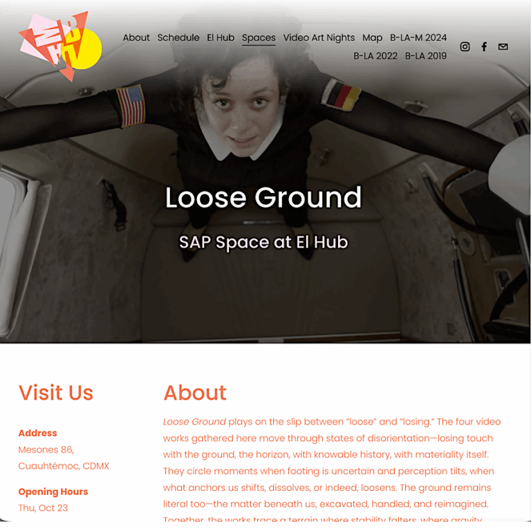 Zero Gravity will be on view in Loose Ground at SAP Space at El Hub MX as part of the B-LA-M Festival in Mexico City, October 23–26, 2025. Bringing together four video works, the exhibition explores moments when perception slips and stability falters—when our sense of ground, history, or material certainty loosens. Through shifting terrains and wavering horizons, Loose Ground invites viewers to consider what happens when what anchors us begins to move. With works by Sebastian Acker, Patricia Detmering, Nadja Verena Marcin, and Ilyn Wong.