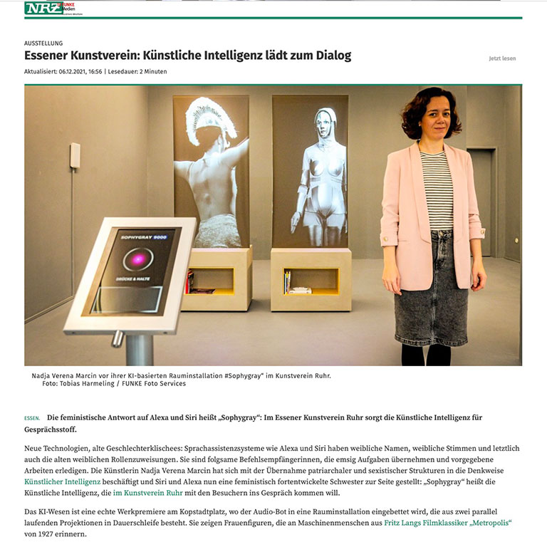 In an article by Martina Schürmann, Neue Ruhr Zeitung presents Nadja Verena Marcin’s #SOPHYGRAY as a feminist response to voice assistants such as Alexa and Siri. The AI-based installation at Kunstverein Ruhr critically examines gendered stereotypes embedded in artificial intelligence.
