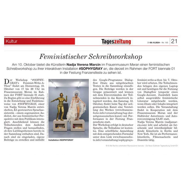 In Neue Südtiroler Tageszeitung, Nadja Verena Marcin’s workshop “#SOPHYGRAY’s Feminist Write-a-Thon” at the Frauenmuseum Meran is featured as part of FORT Biennale 01. The article highlights the interactive AI installation as a space for dialogue and feminist reflection.