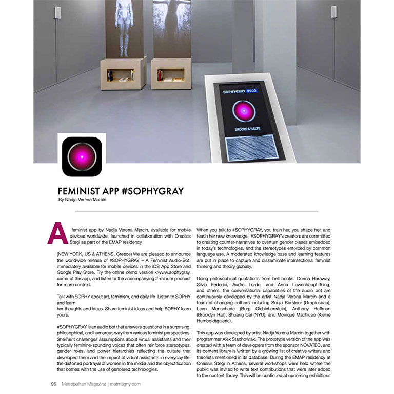 In Metropolitan Magazine, Adam Kluger writes about Nadja Verena Marcin’s “Feminist App #SOPHYGRAY”, an audio-based feminist chatbot that critically examines gendered technologies, language, and power structures.