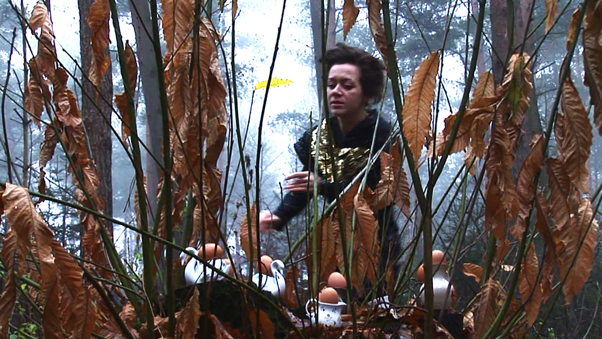 She drives along with silent companions – stuffed animals wrapped in white cloth – until she suddenly stops to retrieve a raw chicken from the road, hiding it beneath her shirt. In the forest, she discovers a nest of tiny porcelain swans, crushing their eggs as she moves past chestnut figures with minced meat bodies, glimpsing into a self-sufficient yet eerie world. Suddenly, her mother appears in the distance, sporting oversized pig ears and drawing her into a duel in an open field. Nervously, the young woman plays the flute until a birthday cake is handed to her – a symbol of burdens carried into adulthood. Later, she finds herself alone, high above the city of Berlin, yearning for connection as she encounters a tango dancer and, later, a man at a dinner table – figures who remain curious, strange, and distant. Through a cinematic lens, the mother, dancer, and man are presented in a fragmented narrative that visually captures the turmoil of coming-of-age. The film explores the comfort and isolation that come with autonomy and independence, set against the pressure, tension, and unease of social expectations and assigned roles.