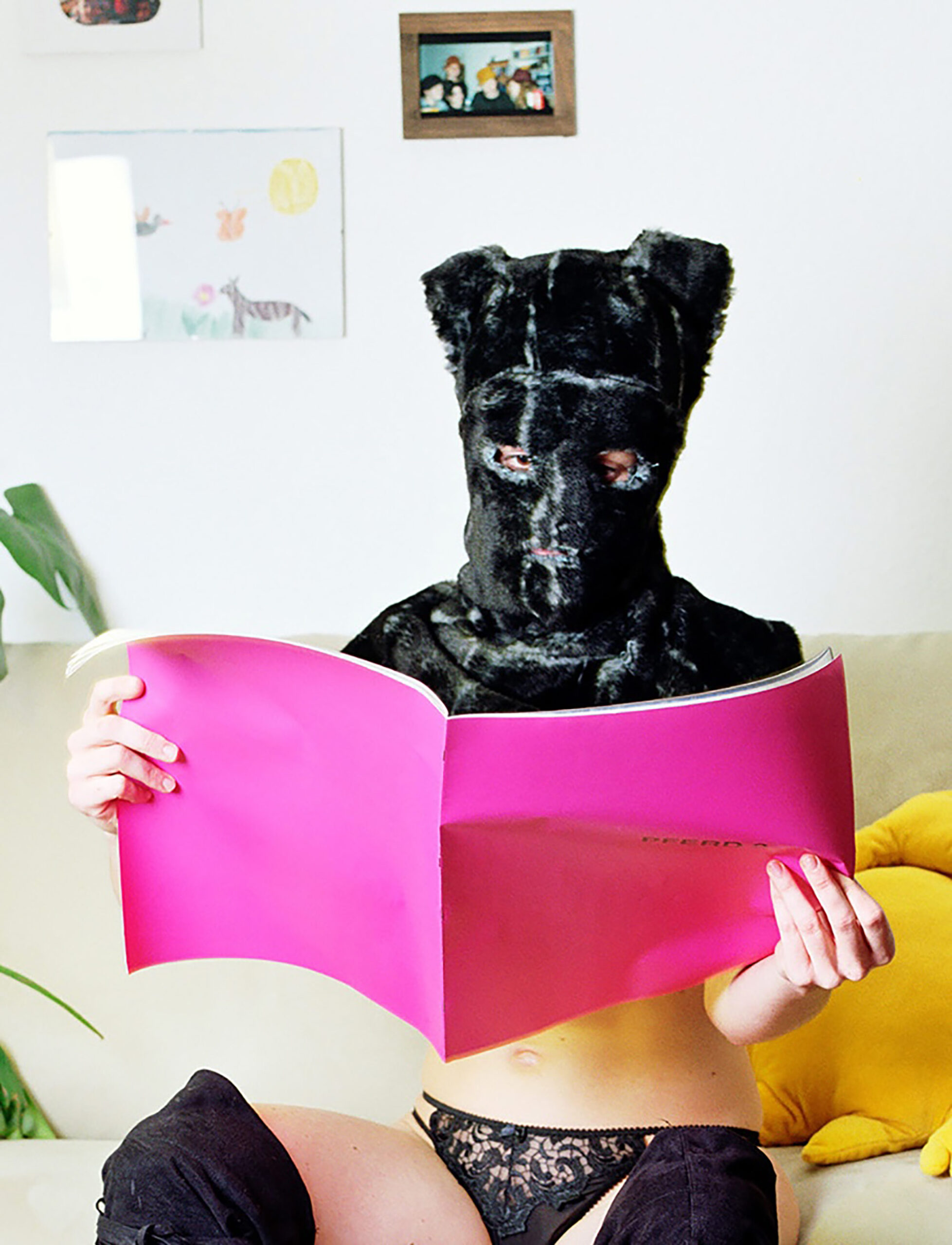 Cat portrays a young woman seated on a couch in the privacy of her home, wearing a furry head mask resembling a cat, black high-heeled suede boots, and black lingerie, while reading a pink newspaper. The lingerie and overall look are undeniably erotic, yet the seriousness of her pose and the focused act of reading lend the scene an unexpected neutrality. This contrast between the sensuality of her attire and the quiet, contemplative nature of the reading disrupts the otherwise conventional display.