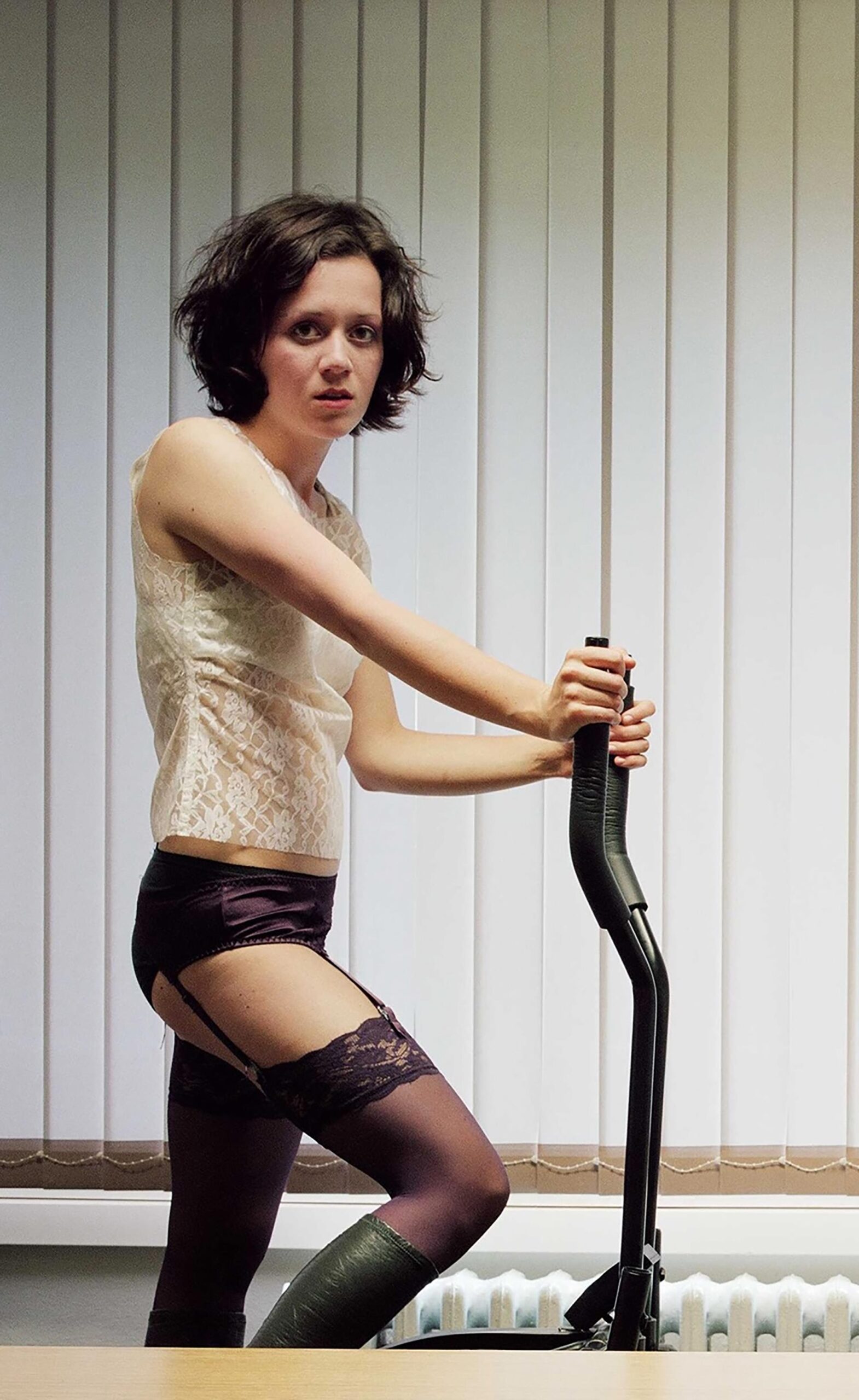 In Service, a young woman stands in erotic lingerie on a cross-trainer, placed within a minimalist office space whose yellow-brown color scheme evokes the office aesthetics of the 1980s. Her expression is one of surprise, as if caught in an unauthorized moment, transforming the public space of the office into a private, intimate zone.